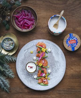Saumon mariné, condiment à la mangue et pickles d’oignons